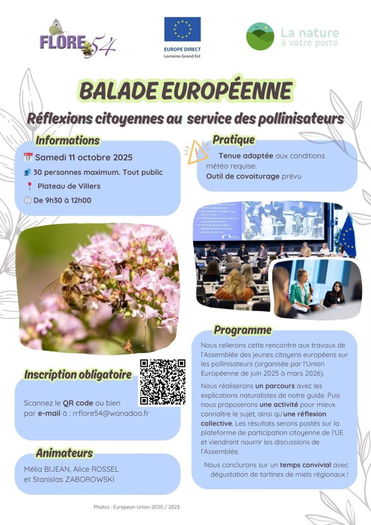 J’animerai une sortie nature sur les pollinisateurs, avec les associations FLORE 54 et CRISTEEL, inscription par mail ou via le QR code indiqué sur l’affiche.
